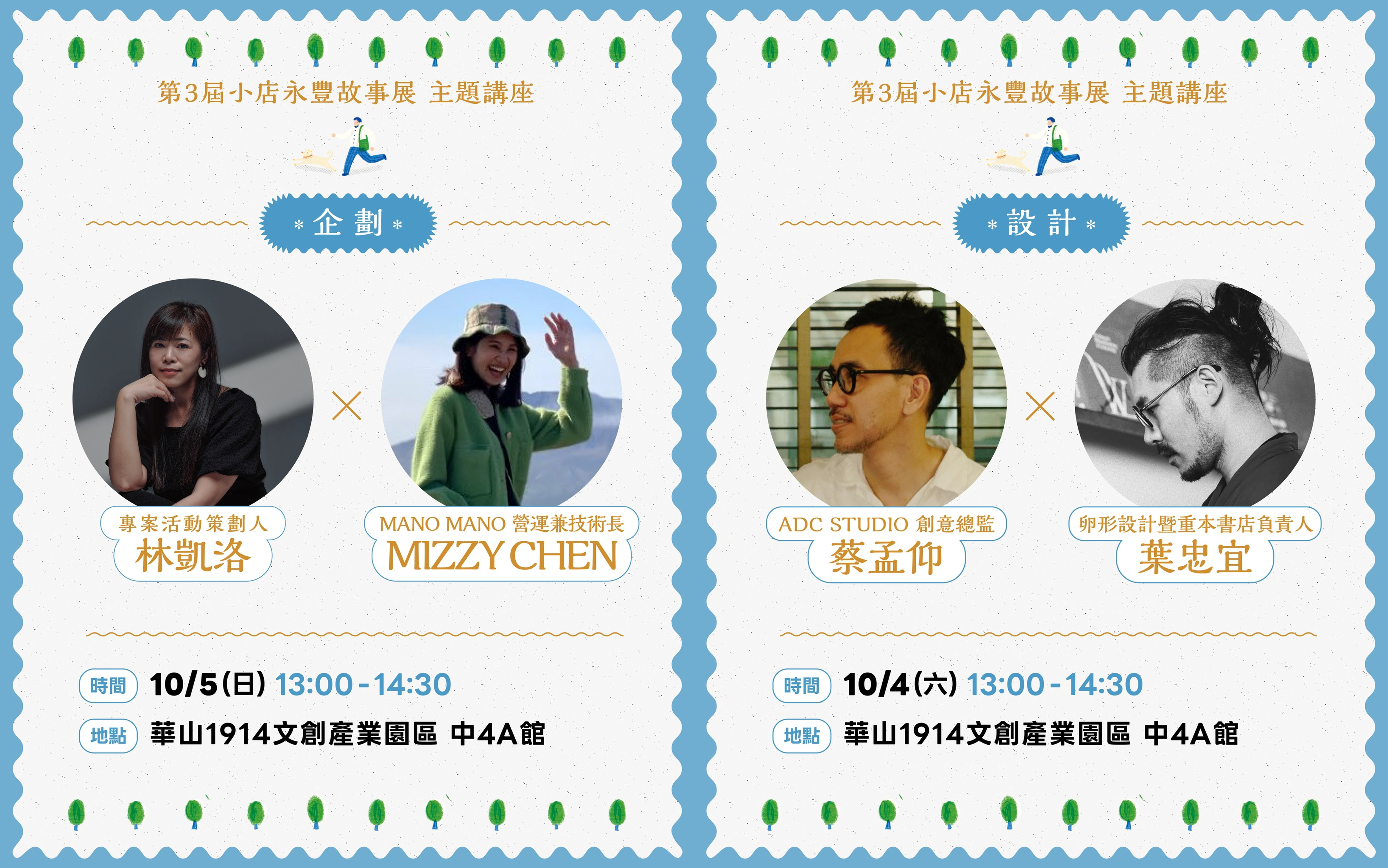 活動會場特別舉辦2梯次「小店主題講座」,從設計與企劃兩大主題切入,分別邀請ADC STUDIO創意總監 #蔡孟仰 與卵形設計暨重本書店負責人 #葉忠宜 ,分享為客戶做設計,以及開始經營品牌開店當店主,換位思考的感想。並由專案活動策劃人 #林凱洛 與MANO MANO 營運兼技術長 MIZZY CHEN以企劃為主題分享,從創立品牌到打造整體完整體驗,深入探討企劃歷程。